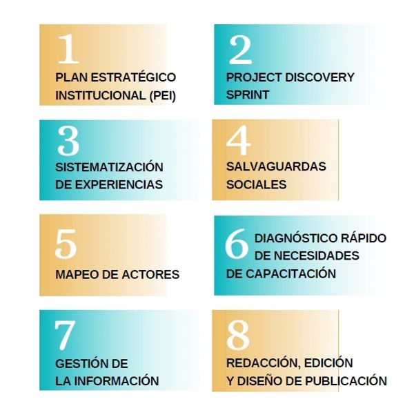 El programa incluye ocho servicios subvencionados: planificación estratégica, sistematización, salvaguardas, mapeo de actores, diagnóstico de capacidades, gestión de información y diseño editorial. Estos pueden combinarse en rutas temáticas como “Reordenamiento estratégico institucional” o “Aprendizaje y capitalización institucional”.